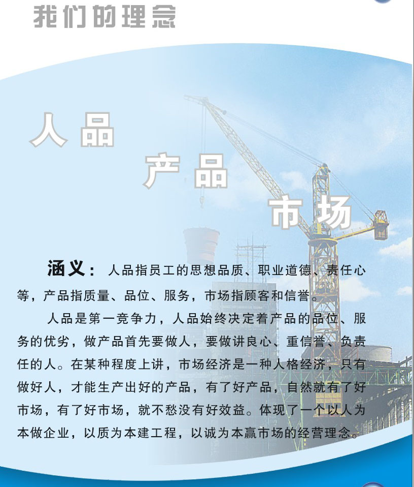 人品是第一競爭力,人品始終決定著產品的品位,服務的優劣,做產品首先要做人,要做講良心、重信譽、負責任的人,在某種程度上講,市場經濟是一種人格經濟,只有做好人,才能生產出好的產品,有了好產品,自然就有了好市場,有了好市場,就不愁沒有好效益。體現了一個以人為本做企業,以質為本建工程,以誠為本贏市場的經營理念。