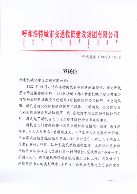 2022年12月7日,呼和浩特市交通投資建設集團有限公司給我司發來表揚信,表揚信中充分肯定了我司呼和浩特新機場項目部在疫情防控工作上作出的努力,展現了我司的社會責任與擔當。